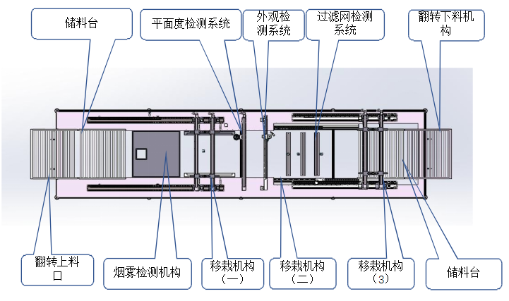 移栽机构(二):采用模组根据产品调节宽距,利用模组将产品移动平面、四周瑕疵、过滤网瑕疵工位检测。