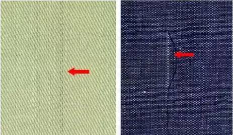 经向疵点:布面上由经纱形成或沿经纱方向形成的疵点。如缺经、断经、粗经、筘痕、双经、穿错、吊经、松经等。